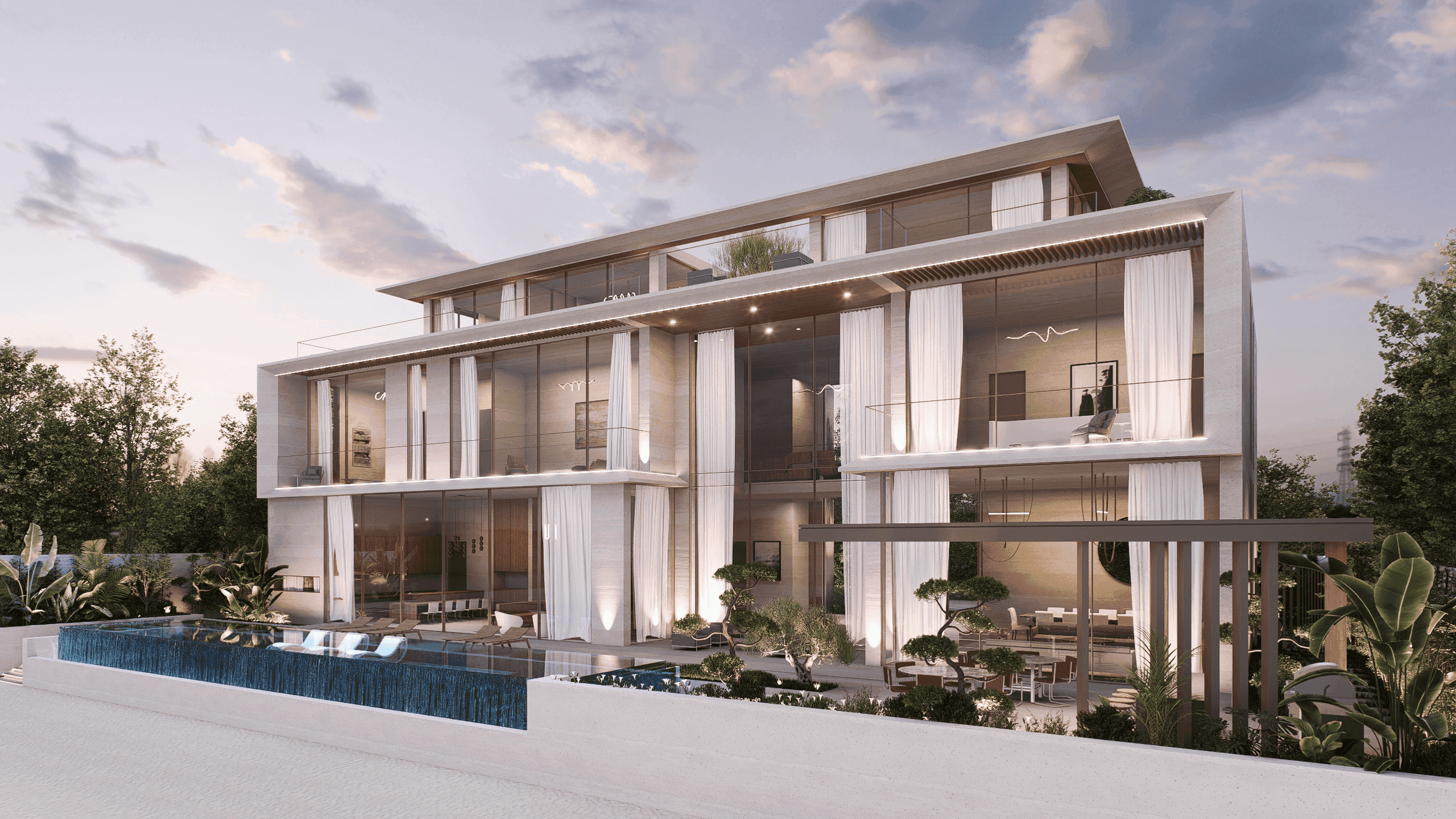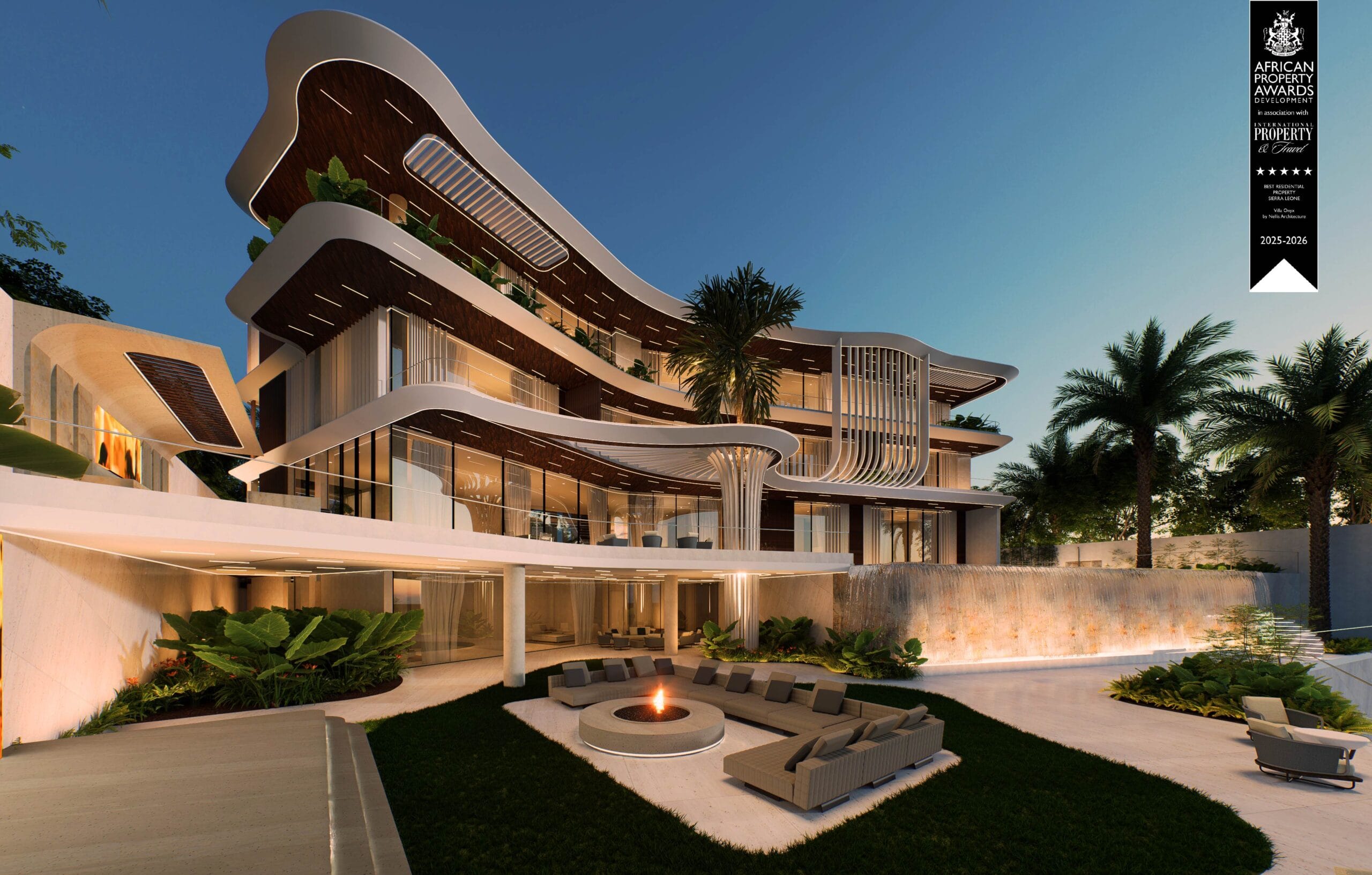 Mila is a four-level family residence conceived around biophilic principles, wellness, and a strong connection to nature, seamlessly balancing everyday family living with the ability to host large gatherings. Defined by a triple-height glass entrance, a 7.1-meter teak sky door, and yacht-inspired curves with light-enhancing flared edges, the home maximises natural light while providing climatic comfort through timber louvres and deep overhangs. Internally, open and inviting living spaces are oriented toward views of the Burj Al Arab, complemented by a penthouse master suite and planted balconies. Outdoor areas, centred around a striking cantilevered glass-bottom pool, combine lush gardens and functional terraces, creating a refined sanctuary that blends aesthetics, comfort, and functionality within the desert environment.