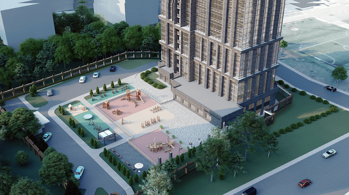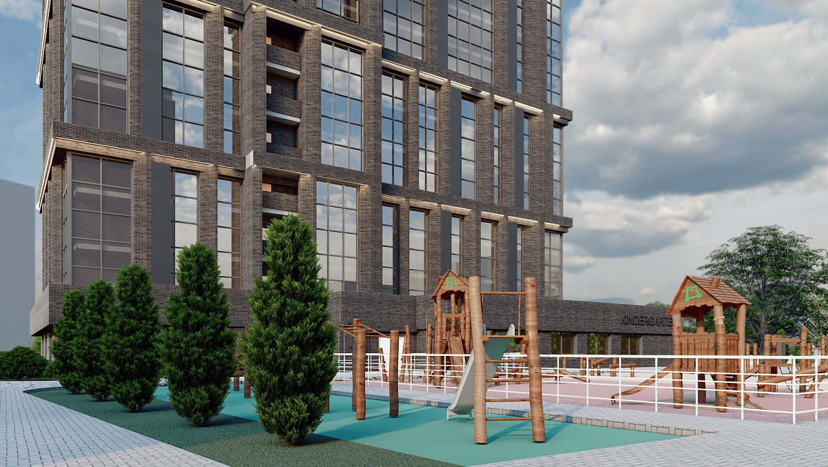 Residential Complex “Aristocrat” presents a refined interpretation of contemporary urban living, defined by elegance, verticality, and timeless character. Rising as a slender landmark within a landscaped setting, the tower’s articulated façade combines textured masonry with expansive glazing, creating a rhythmic balance between solidity and transparency. Carefully stepped volumes enhance the building’s proportions while maximising natural light and panoramic views for residents. Anchored by a composed base and complemented by thoughtfully designed surroundings, Aristocrat offers a distinguished residential experience that blends architectural prestige, comfort, and a sense of exclusivity within the city fabric.