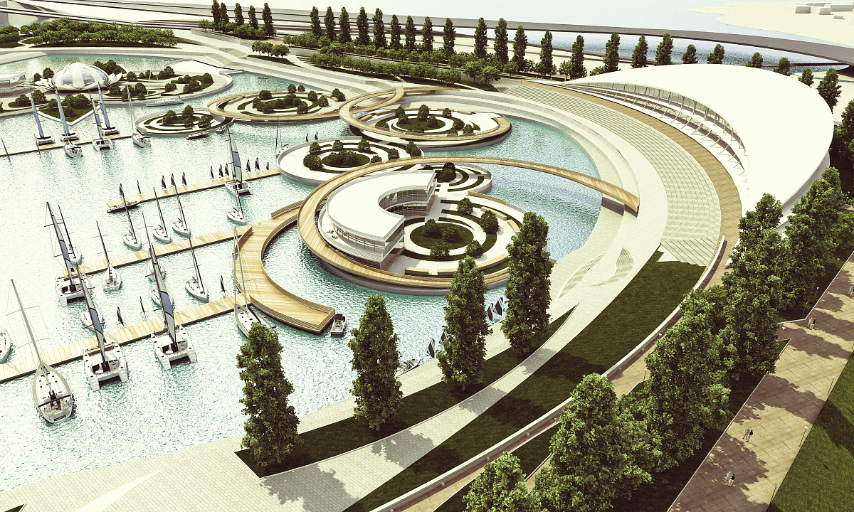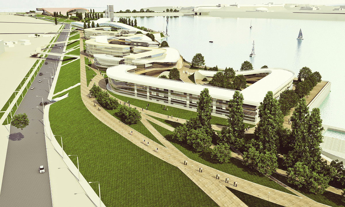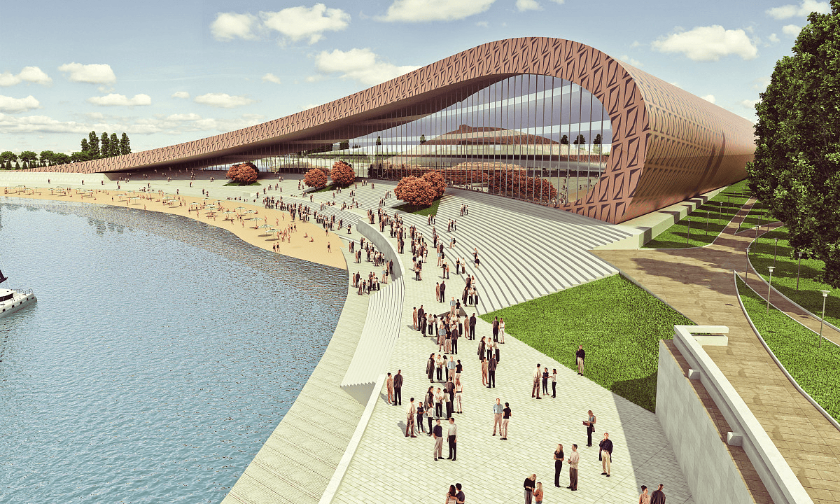 Positioned along the Right Bank of the Kazanka River, this project transforms the waterfront into a dynamic civic destination that seamlessly connects architecture, landscape, and public life. A sculptural, fluid building form anchors the site, its patterned façade and expansive glazing reflecting movement, light, and the river itself. Terraced steps cascade down to the water’s edge, creating a natural amphitheatre that encourages gathering, leisure, and uninterrupted engagement with the riverfront. Blending cultural, recreational, and social functions, the development redefines the riverbank as a vibrant urban promenade and a new landmark within the city’s public realm.
